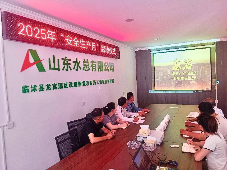 为大力推进项目安全生产工作,提高全员安全意识,迅速营造“安全生产月”活动氛围。近日,第三分公司以郯城县李庄灌区项目部作为主会场召开2025年“安全生产月”动员会暨启动仪式,各项目部视频参会。